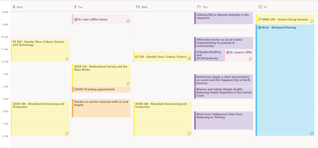 I have a mixture of synchronous and asynchronous courses this quarter, which helps me figure out what days and times I need to allocate for studying for each class. Below is how a typical Monday looks like for me: